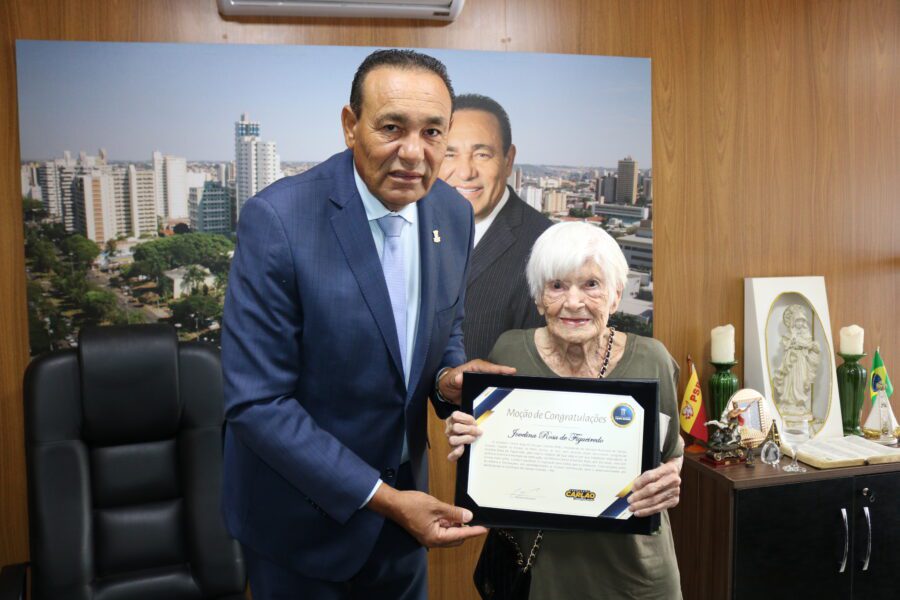 Na manhã desta terça-feira (04), o vereador Carlos Augusto Borges (Carlão PSB), entregou em seu gabinete na Câmara Municipal de Campo Grande MOÇÃO DE CONGRATULAÇÕES à senhora Jovelina Rosa de Figueiredo, com 101 anos, pelo marco notável de sua vida e por sua trajetória inspiradora. A senhora Jovelina é exemplo de dedicação, resiliência e amor à família, ela construiu uma bela história ao lado de seu esposo, Oswaldo Marques de Figueiredo, renomado profissional que marcou a história de Campo Grande como primeiro médico, além de ser dentista e jornalista.